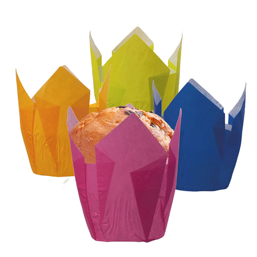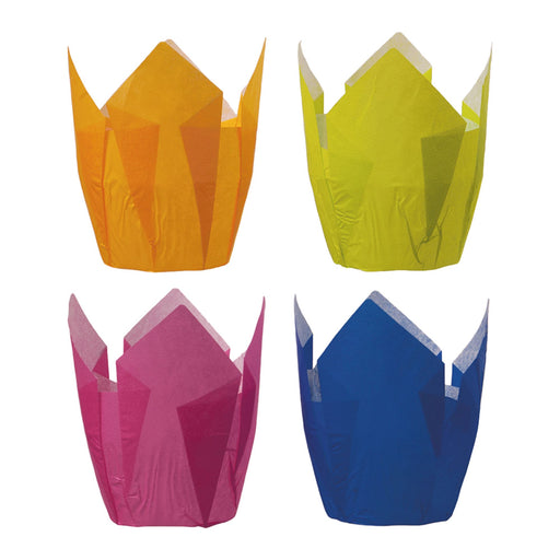 Sehr dekorative Tulpenförmchen in vier verschiedenen Farben (ca. 8 cm) aus Papier zum Backen von Törtchen, Kleinkuchen, Muffins und Kleingebäck. Di...