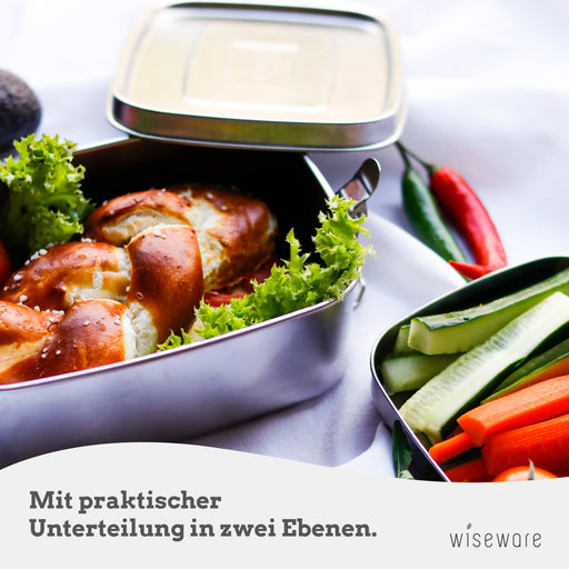 Edelstahl Lunchbox - Brotdose / Snackbox mit 2 Ebenen: Nachhaltig und praktisch Unsere Wiseware Lunchbox aus Edelstahl ist die ideale Alternative z...
