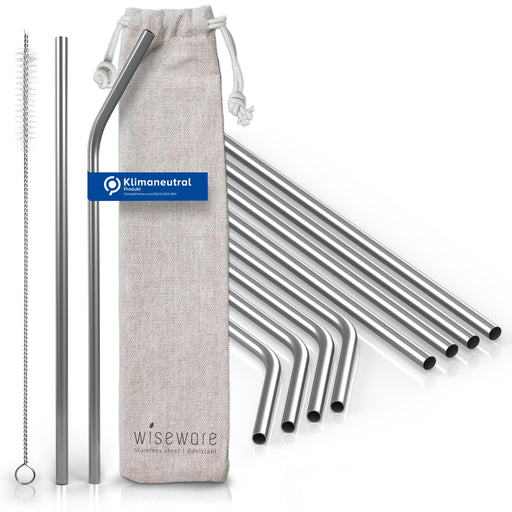• Edelstahl Trinkhalm Set 10 Stk. (5 gerade Strohhalme, 5 gebogene Strohhalme, 1 Bürste, 1 Jutebeutel) - Wiseware