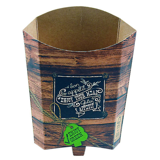 Unsere umweltfreundliches Pommes-Frites-Schütte besteht aus einen stabilen Karton und hat ein modernes, rustikales Holzmotiv und machen dadurch die...