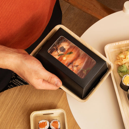 Vollständige Details anzeigenBio Sushi Take-Away Box, aus Palmblatt mit Sichtfenster, LEEF, 17 × 12 × 5 cm