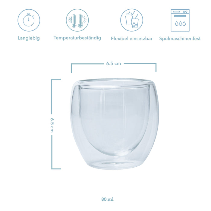 Unsere doppelwandigen Espresso-Gläser vereinen Stil und Funktionalität. Das doppelwandige Design ermöglicht es dir, deinen Espresso auch bei hohen Temperaturen bequem zu halten, ohne deine Hände zu verbrennen. So kannst du jeden Schluck deines Lieblingsgetränks in vollen Zügen genießen.