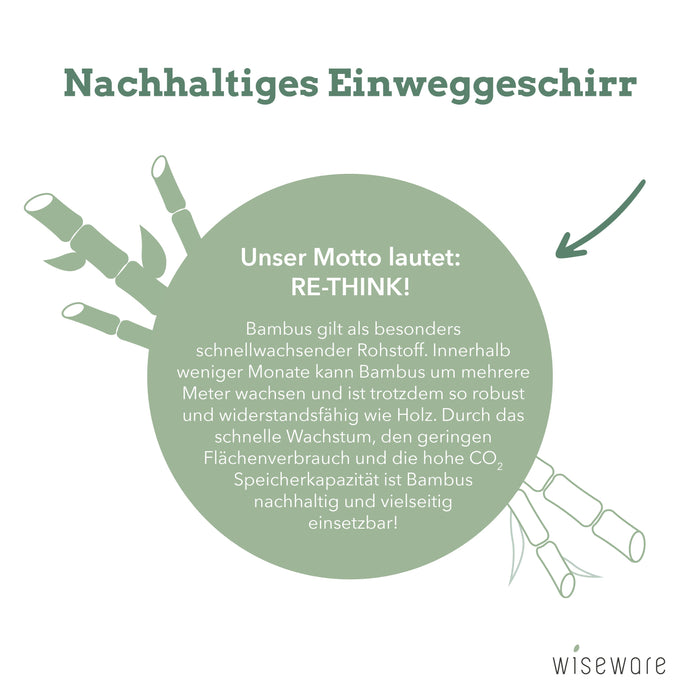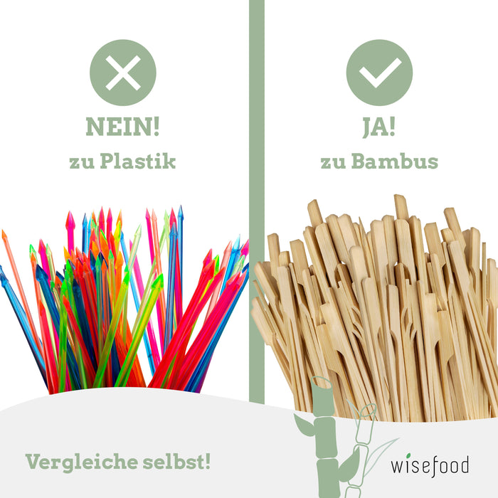 PLASTIK ALTERNATIVE: Unser Motto: Schluss mit Tonnenweise Müll durch Plastikgeschirr! Mit Wisefood geht Einweggeschirr nachhaltig. Unsere Spieße aus Bambus/Pinienholz stammen aus nachhaltiger Produktion. Plastik war gestern – heute konsumieren wir umweltfreundlich!