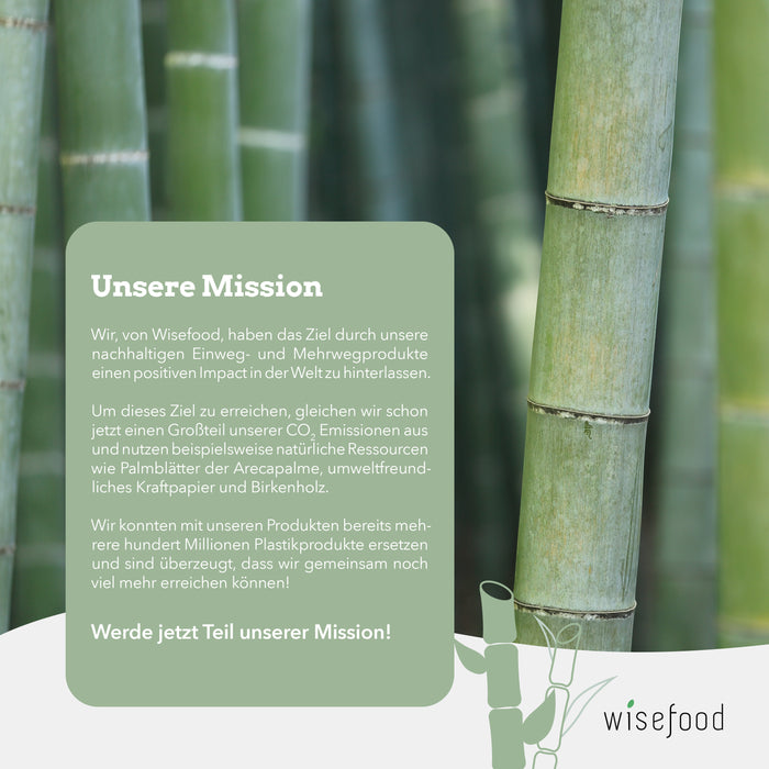 Genau diese Tatsache leben wir jeden Tag aufs Neue. Wir von Wisefood sind einer der führenden Anbieter für ökologisch unbedenkliches Einweg- und Mehrweggeschirr. Unser Ziel ist es, mit unseren Erzeugnissen einen positiven Fußabdruck in der Welt zu hinterlassen. Schon heute gleichen wir den überwiegenden Anteil unserer CO2-Emissionen aus und nutzen für unsere nachhaltigen Produkte natürliche, schnell nachwachsende Ressourcen wie unter anderem Birkenholz, Palmblätter der Betelpalme, umweltfreundliches Kraftpapier und Bambus.