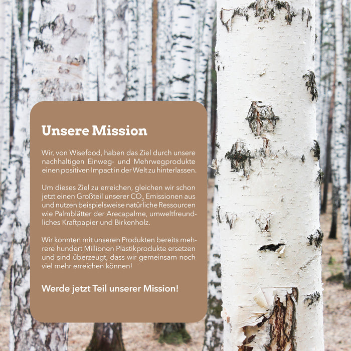 Das Holzgeschirr stammt aus ökologischer Produktion und ist Teil eines nachhaltigen Herstellungsprozesses. Das verwendete Birkenholz ist zertifiziert und stammt aus nachhaltiger Forstwirtschaft. Dies bedeutet, dass das Holz aus Wäldern stammt, die unter strengen Umweltauflagen bewirtschaftet werden, um die langfristige Gesundheit des Waldökosystems zu gewährleisten.