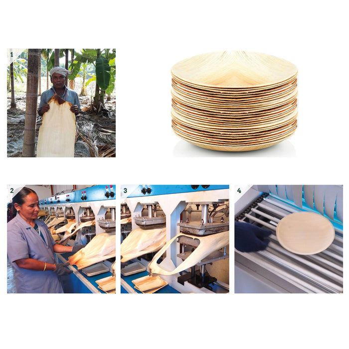 In den Produktionsstätten fallen Palmblätter als Reststoff auf Plantagen für Betelnusspalmen an. In den meisten Fällen werden die Palmblätter als natürlicher Dünger benutzt oder sogar nur weggeworfen. Um den Palmblättern ein zweites Leben zu schenken nach dem “waste-to-value” Prinzip, wird aus den Palmblättern Einweggeschirr hergestellt.
